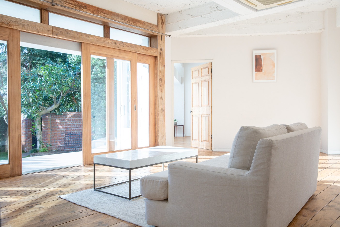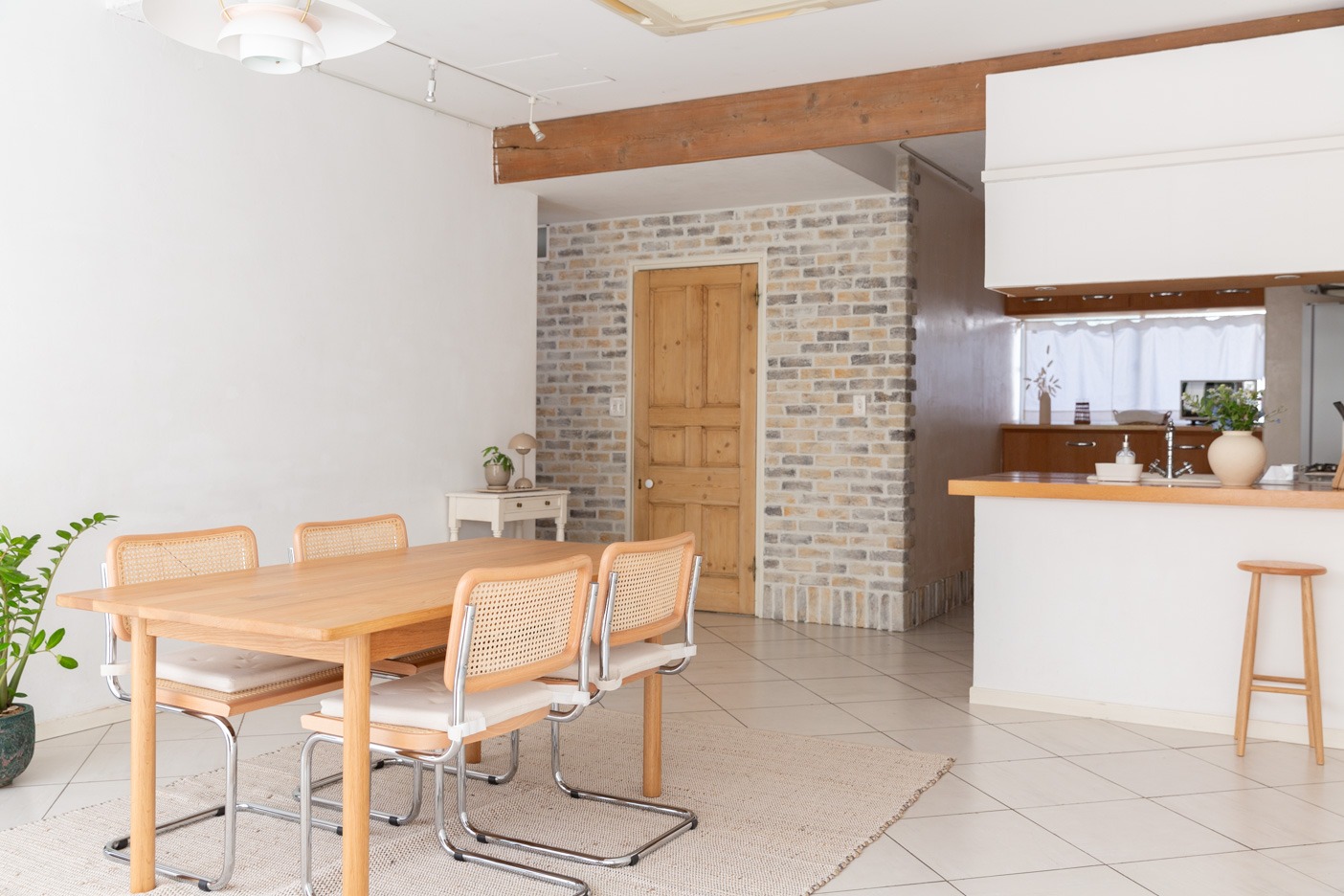 1Fは広い空間となっており、ダーク系のウッドを使った建具と100年物のアンティーク床材が、リビングをシックかつ重厚感のある雰囲気に仕上げています。