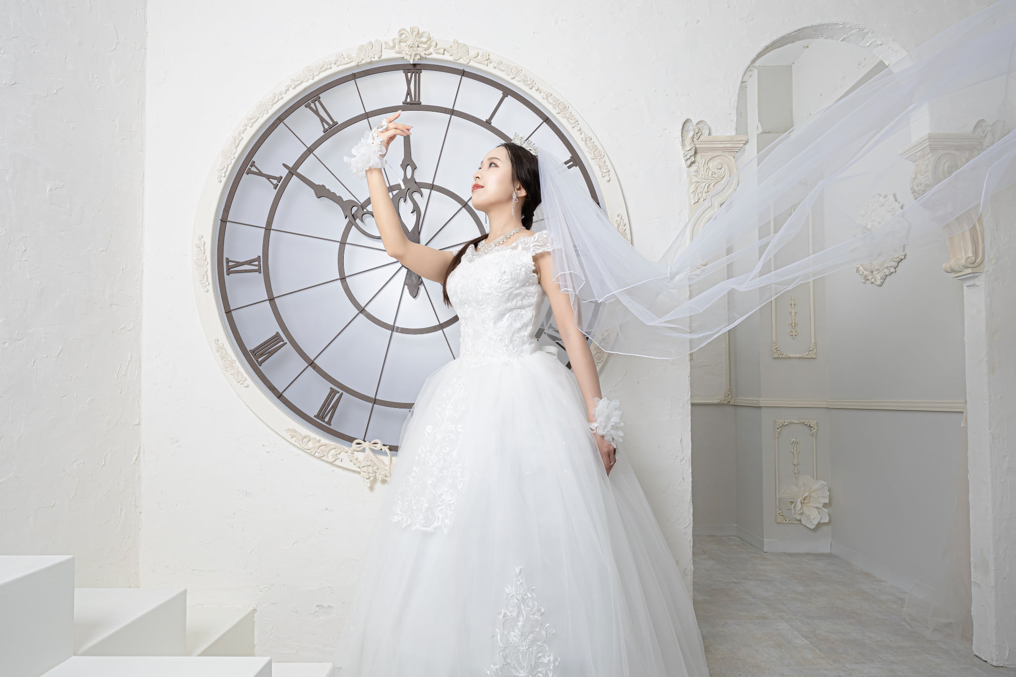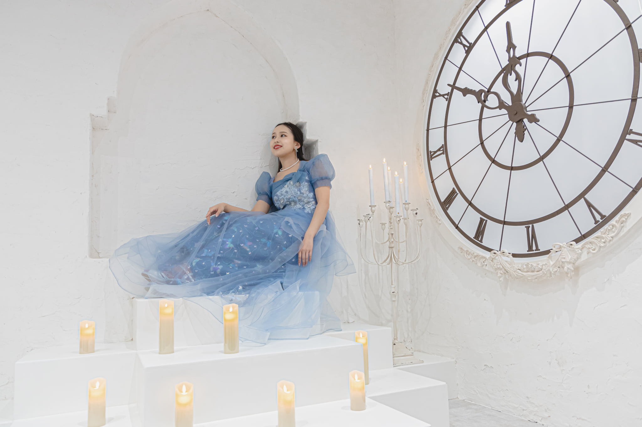 巨大なケーキや蝶、時計台の前であなたはエレガントな妖精に! 既視感のない8つの背景に合わせて様々な撮影が可能です。 10着のドレスや衣装が無料・着放題!