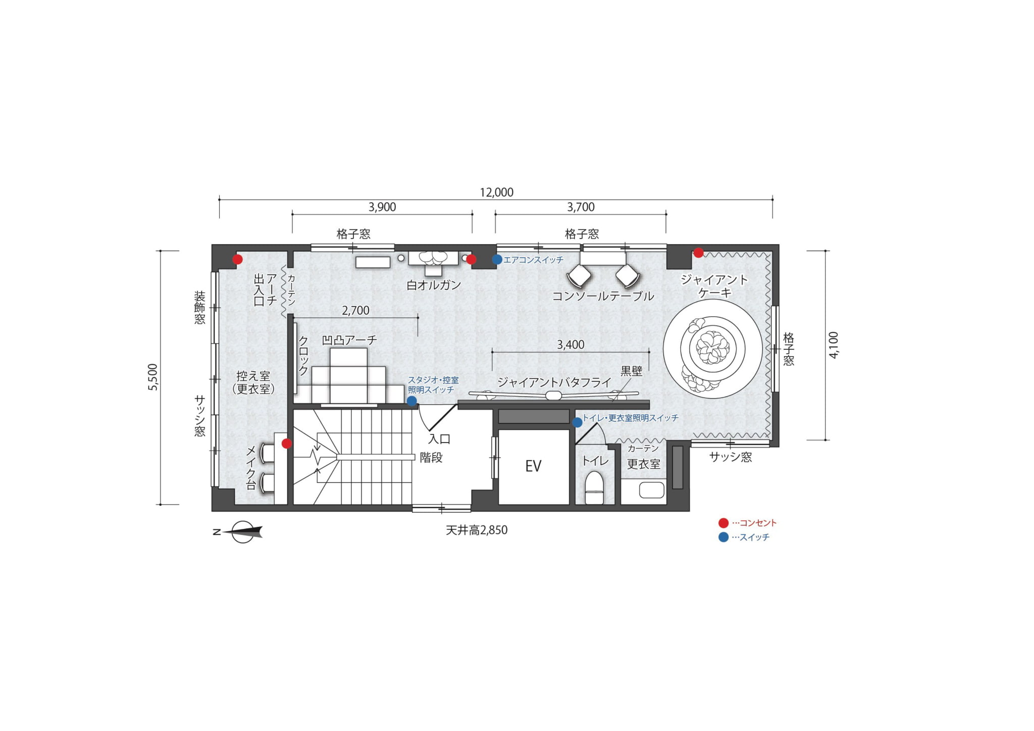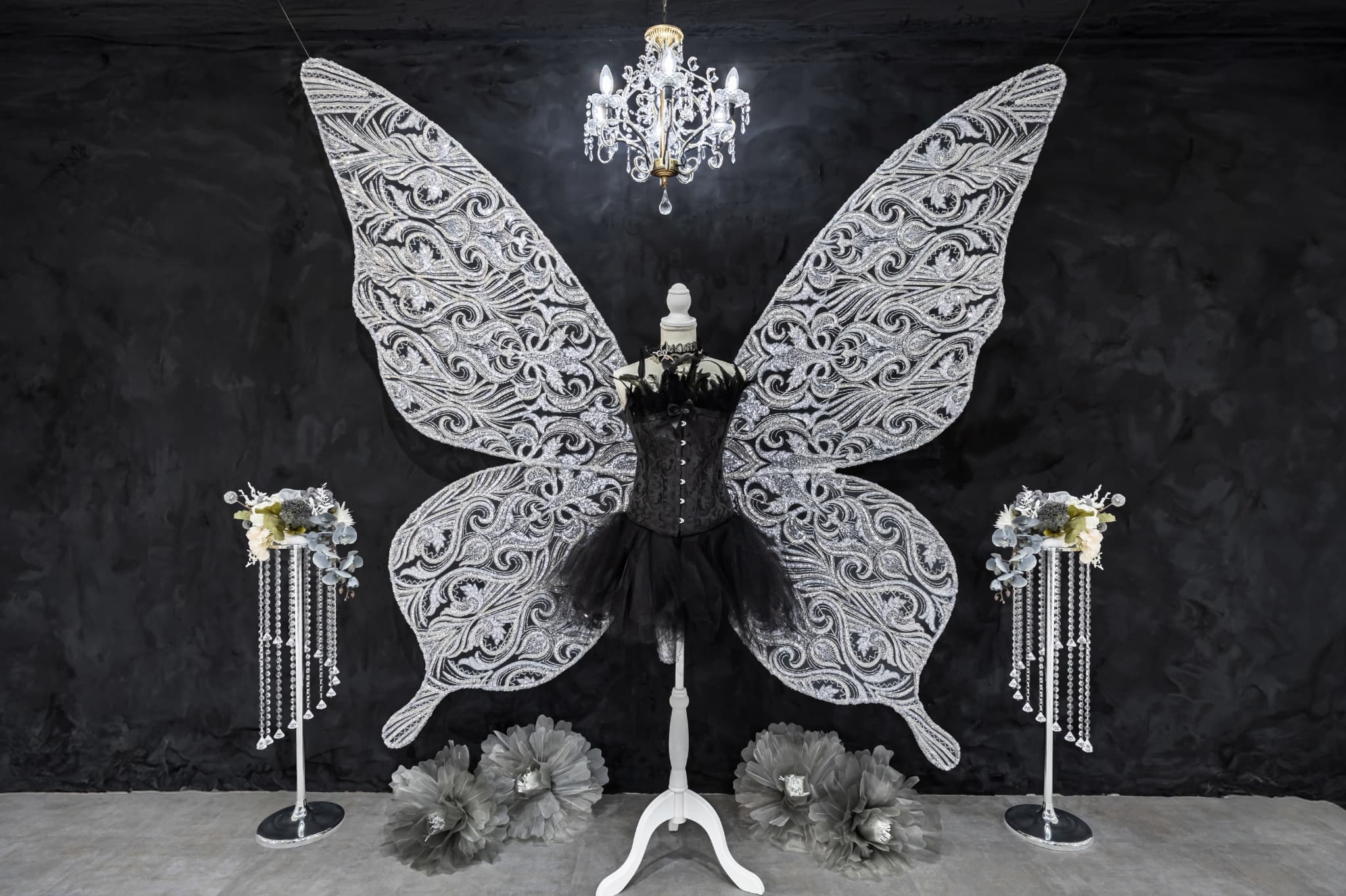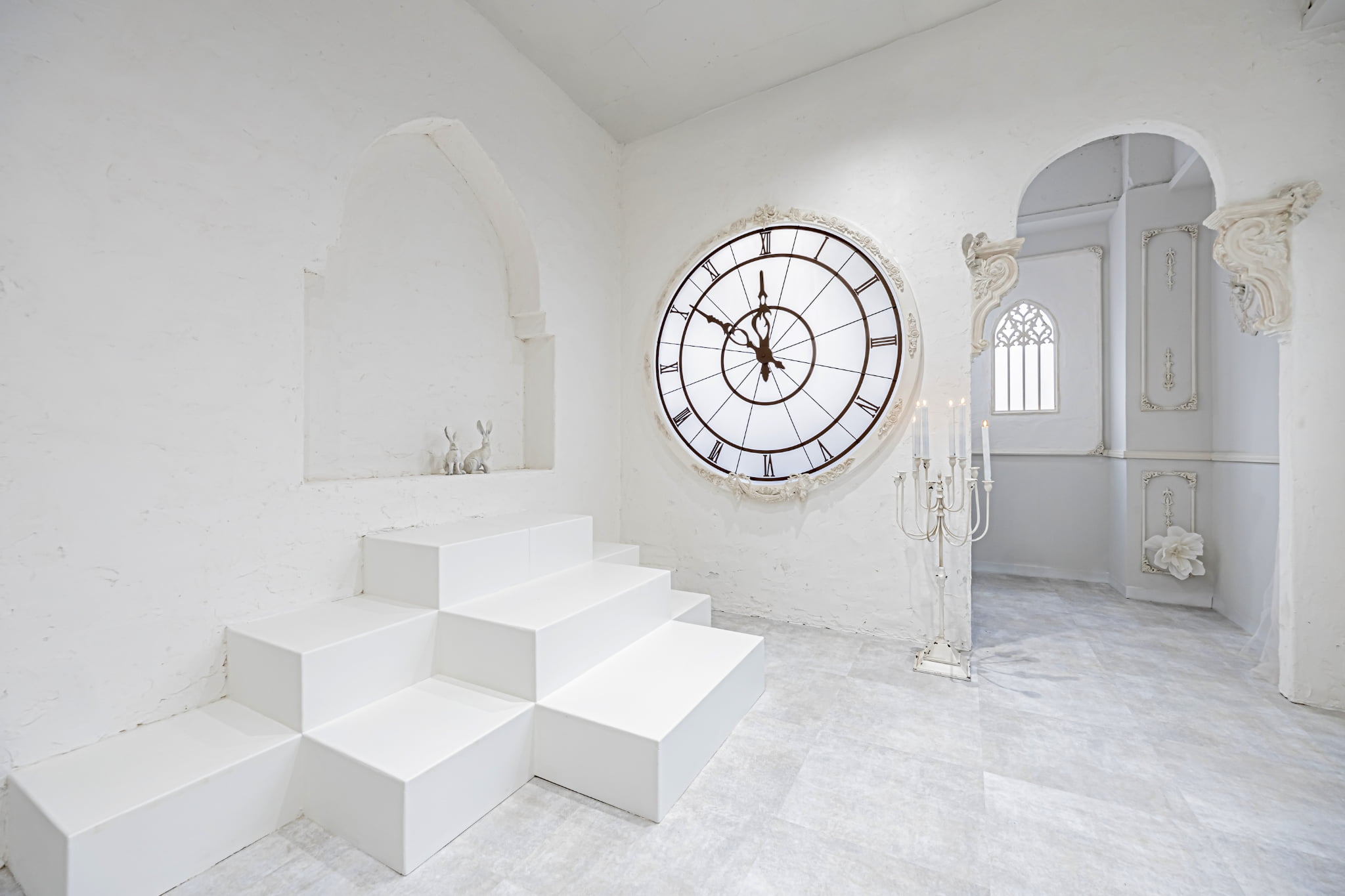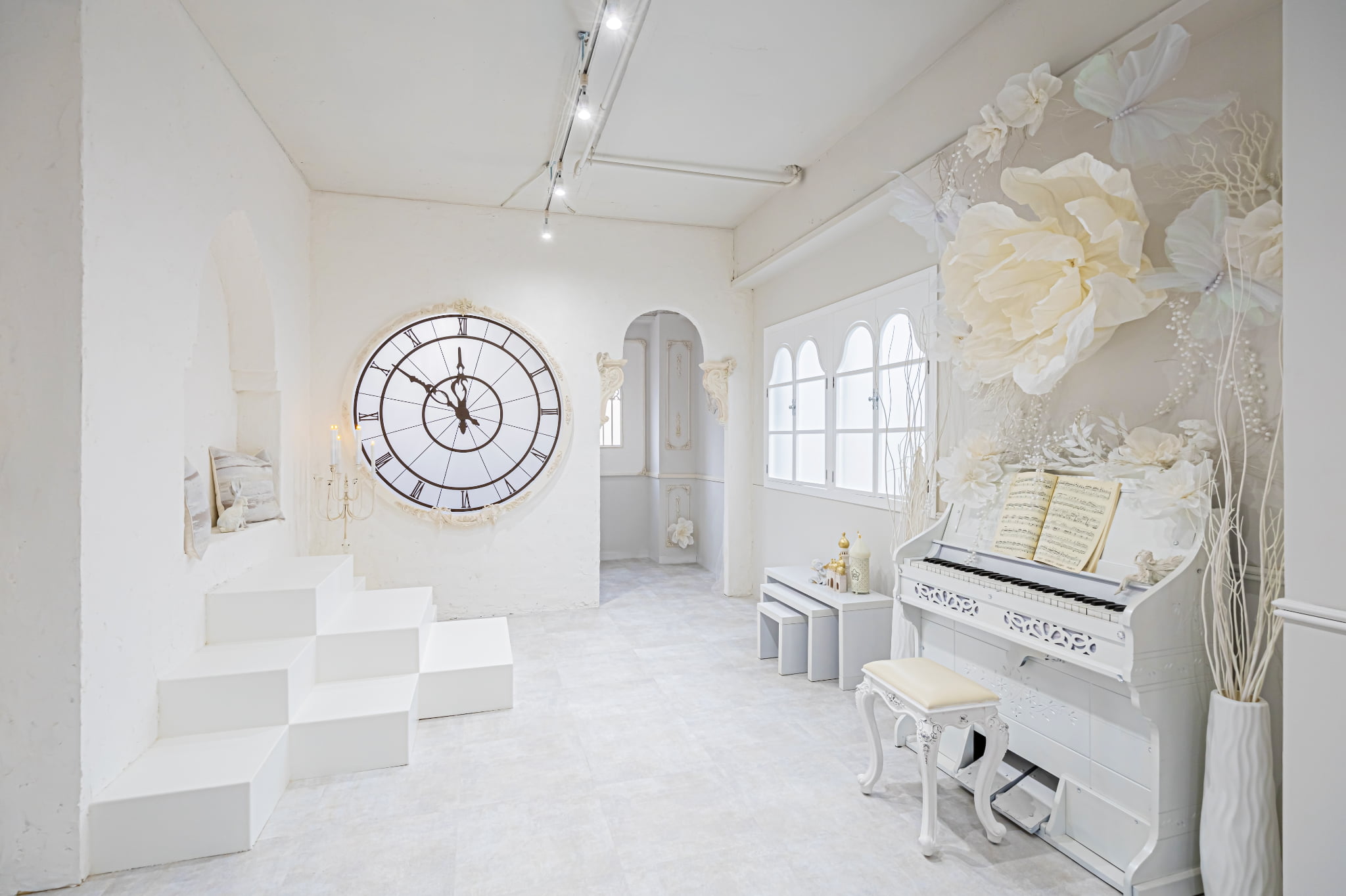 ①花に彩られた巨大なケーキにドレスで座ればあなたは妖精そのもの! ②デザイナー製作による時計台のインスタレーション。エレガントなシーンが撮影可能です。 ③当スタジオの目玉・シルバーの巨大なバタフライ&黒漆喰壁 ④4面採光。午前午後ともたっぷり差し込む自然光 ⑤チャペルのようなアーチや白いオルガン、階段&白漆喰壁 ⑥エレガントな家具や小物多数 ⑦妖精になれるロングドレスや衣装が無料・着放題! ⑧撮影機材が豊富。全て無料! ⑨LIVE配信に対応!高速WiFi設置 ⑩ご利用後、次回よりおトクになるお得意様割あり