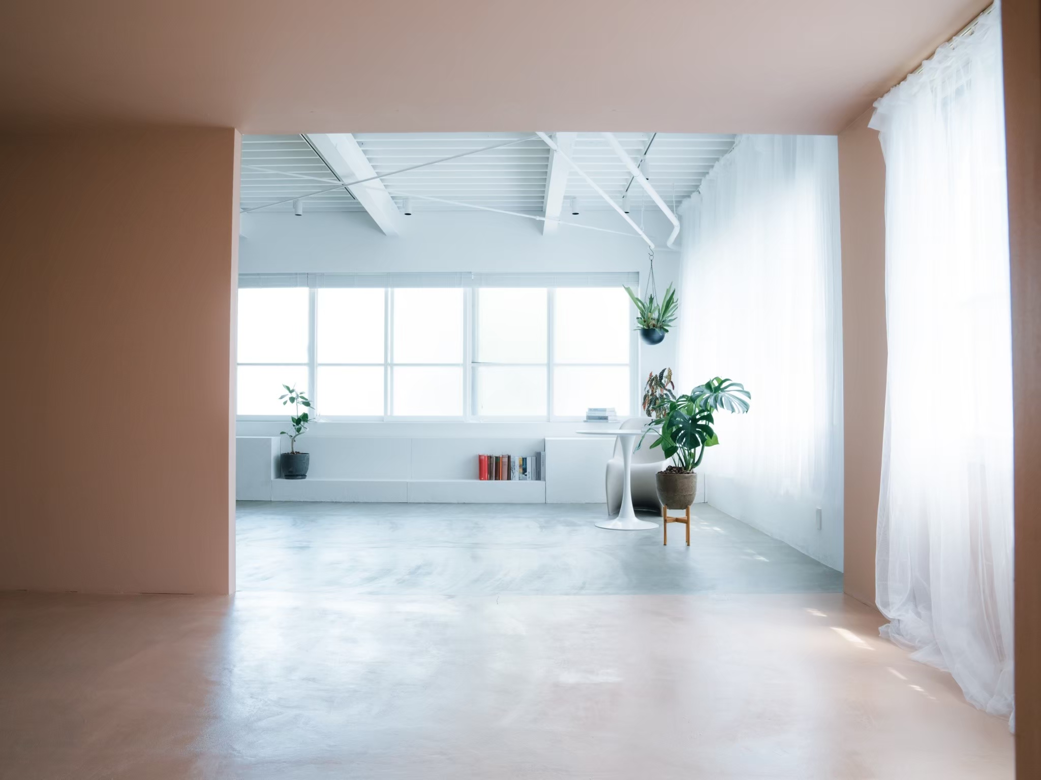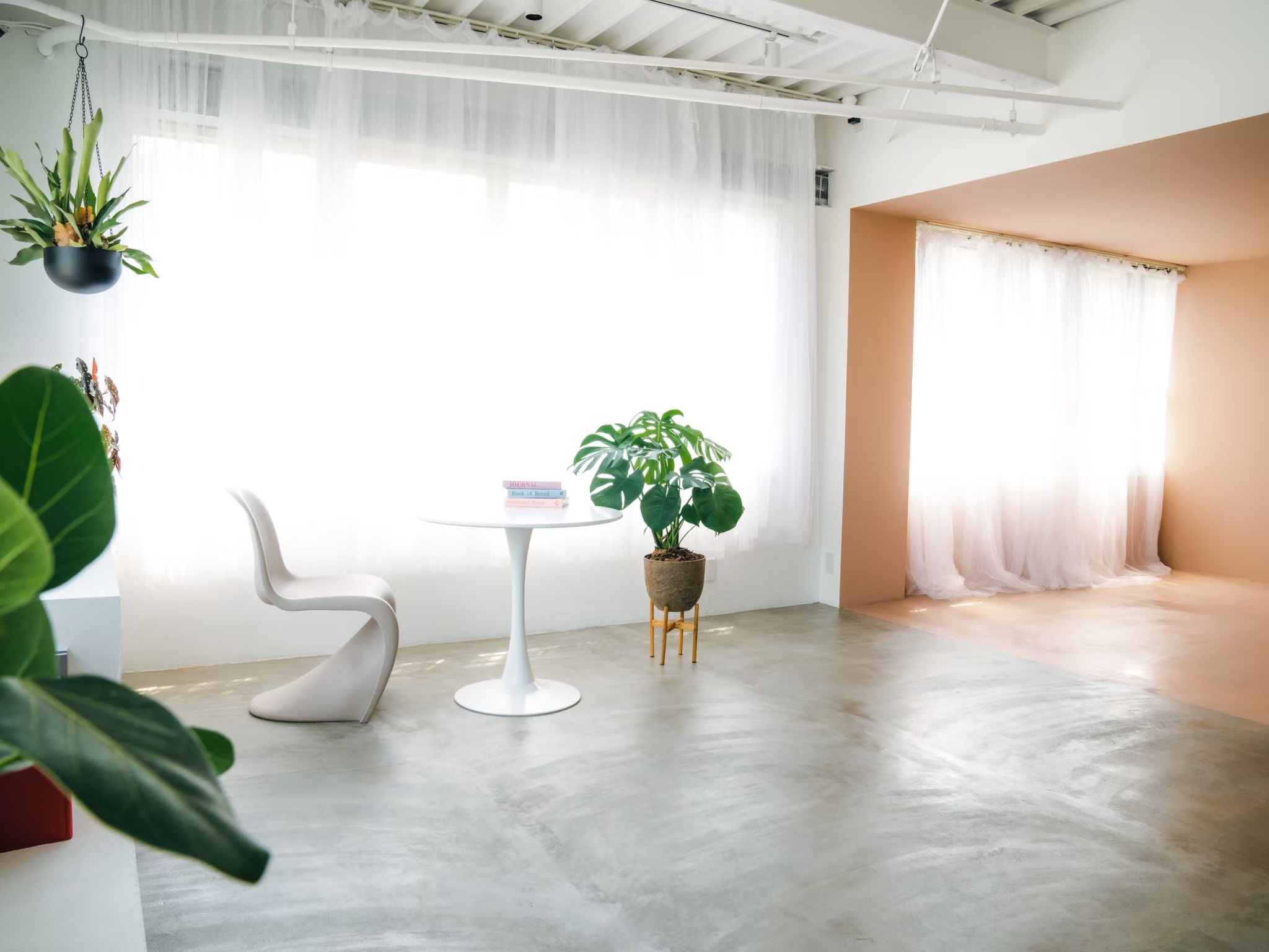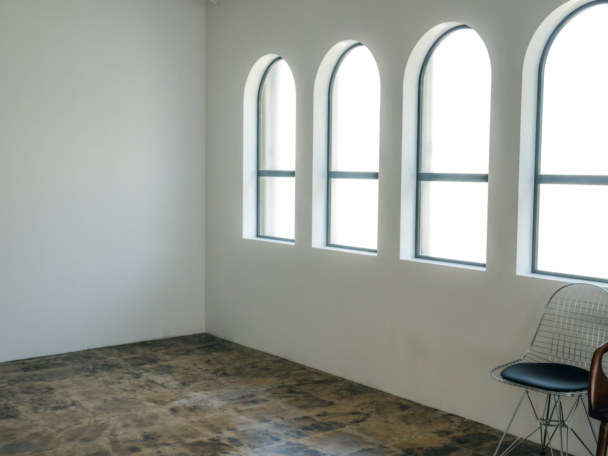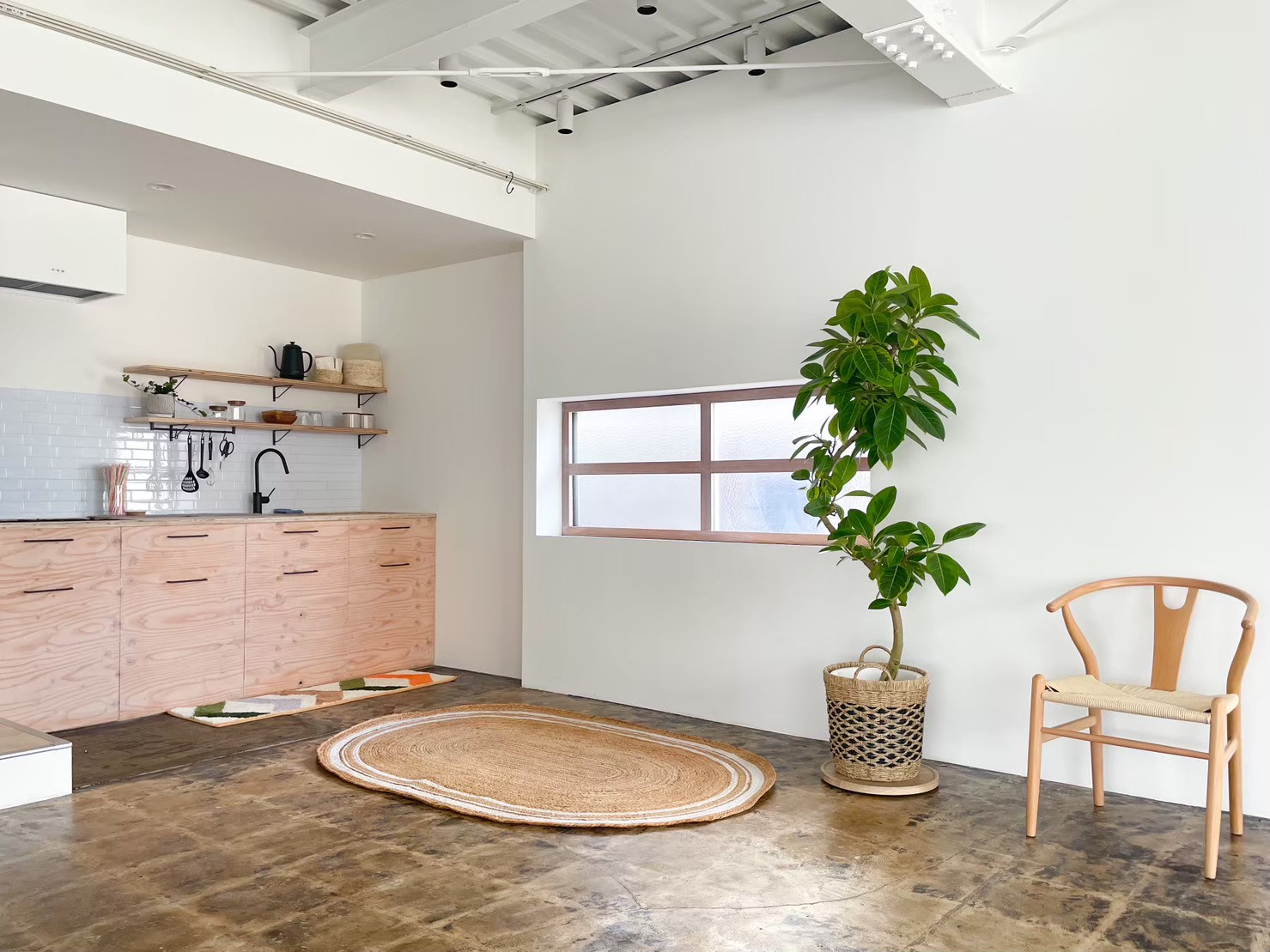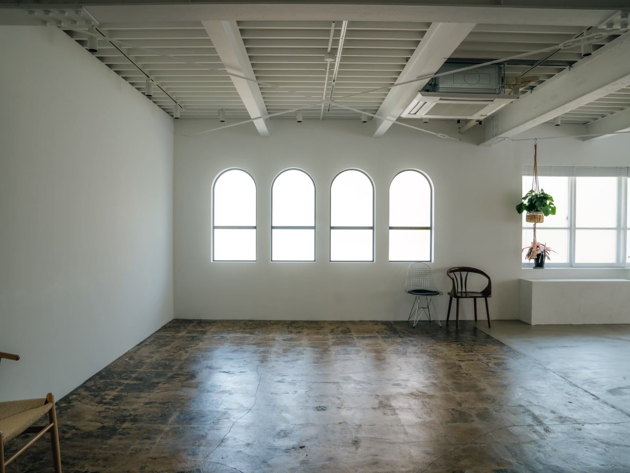 モルタル床、アーチの窓、ピンクの空間を持つ100平米の明るい空間で、撮影用キッチンも有り。POPな小物やミッドセンチュリーの背景など様々なシーンでの撮影が可能。