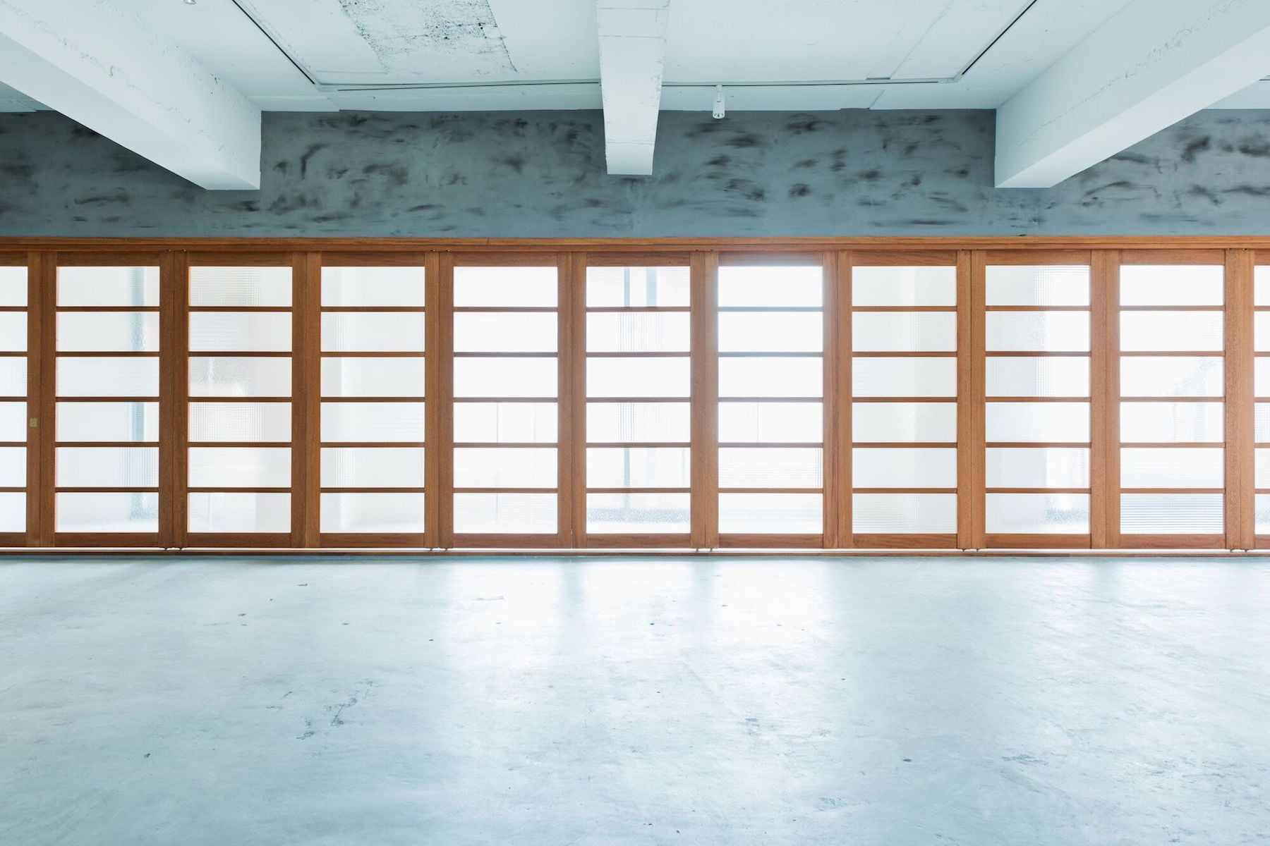 モルタルとホワイトで構成された無機質な広いスペースには、古材を使用した雰囲気ある建具が随所に配置されています。